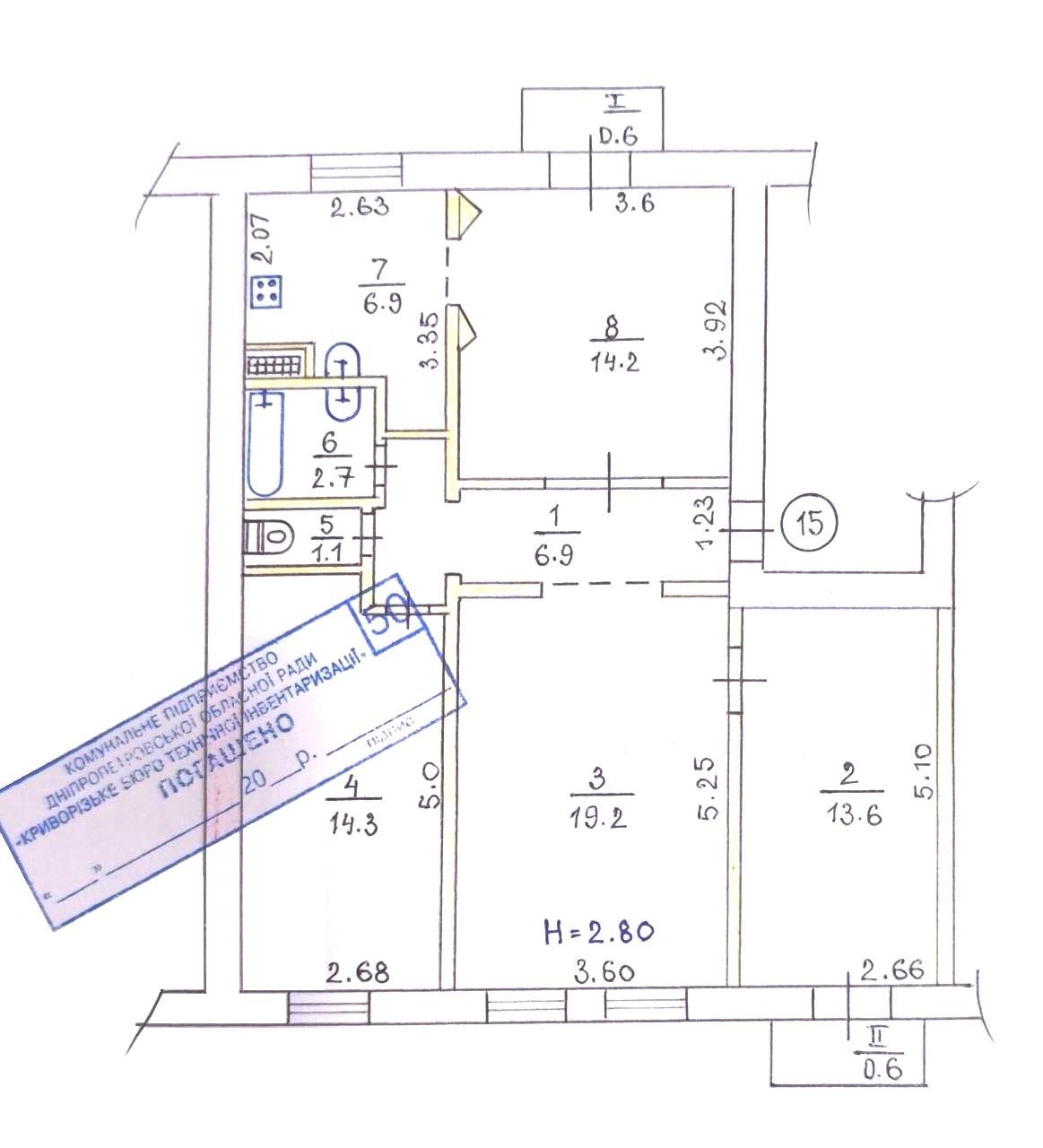 Планування об'єкту: - узаконене перепланування. - вітальня 19.2 м.кв. - спальні кімнати 14.3 + 13.6 м.кв. - столова та кухня 14.2 + 6.9 м.кв. - високі стелі 2.80 м. - маємо 2 балкони. - квартира двостороння.