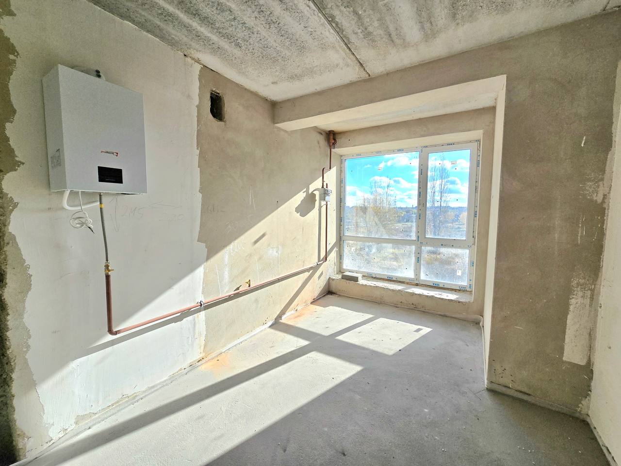 Площа квартири 39.24 кв.м Поверх 2/10. У квартирі виконано стяжку та штукатурку, встановлено двоконтурний газовий котел.