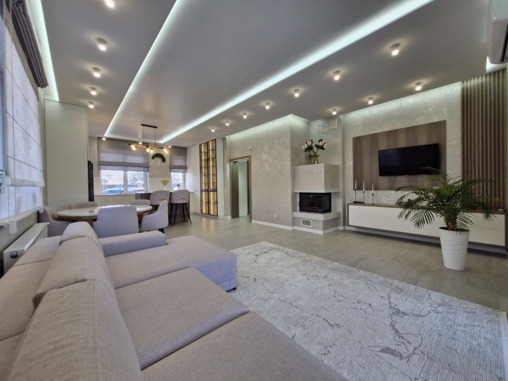 • Кухня-вітальня з каміном та виходом на терасу. У кухонній зоні розміщений острівець зі стільницею з натурального каменю та вбудованою шафою для зберігання вина.