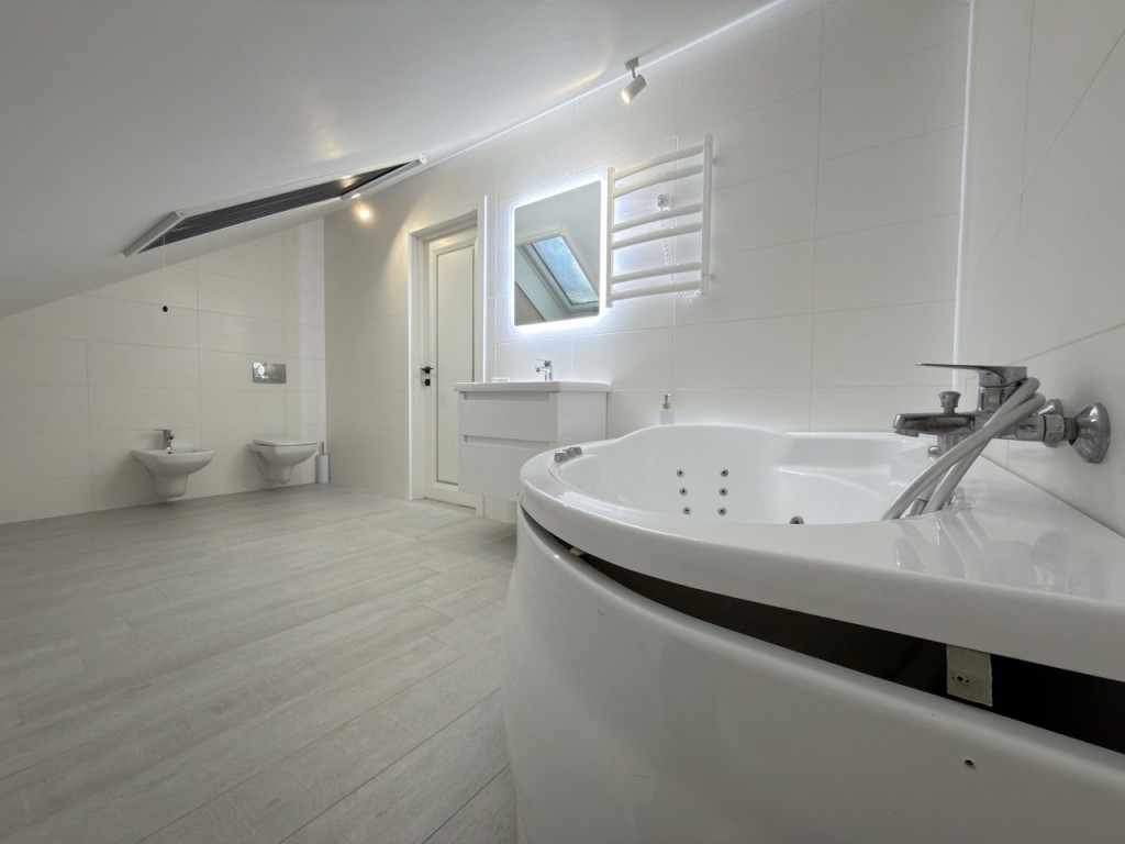 • Кухня змонтована з матовим акрилом, укомплектована посудомийною машиною, газовою варильною поверхнею, вмонтованими духовою шафою та мікрохвильовою піччю.