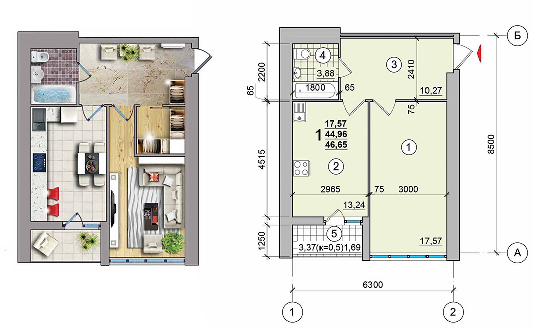 1-кімн.кв. загальною площею: 42,08м,