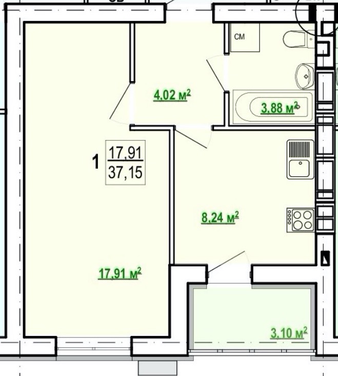 Загальна площа: 37 кв.м