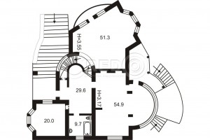 - 1 поверх: гостьова 51, 3кв.м., кухня столова 54, 9кв.м. з виходом на терасу, кабінет 20кв.м., с/вузол 9, 7кв.м